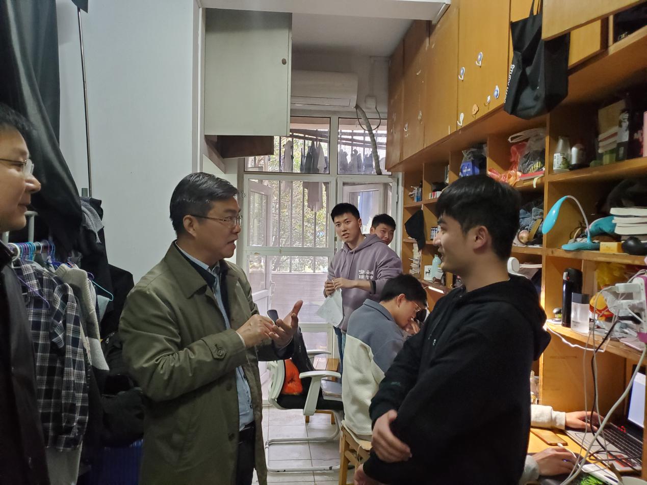 王敦宝书记一行来到员工宿舍,仔细查看宿舍居住条件、环境卫生、用电安全、消防安全设施等情况,了解同学们在校学习生活状态。在走访中,王书记认真听取了同学们对公司各方面工作的意见和建议,鼓励大家积极创造良好的生活环境,营造良好的学习氛围,并对宿舍空间、安全文明、公共环境建设等提出了针对性的指导。