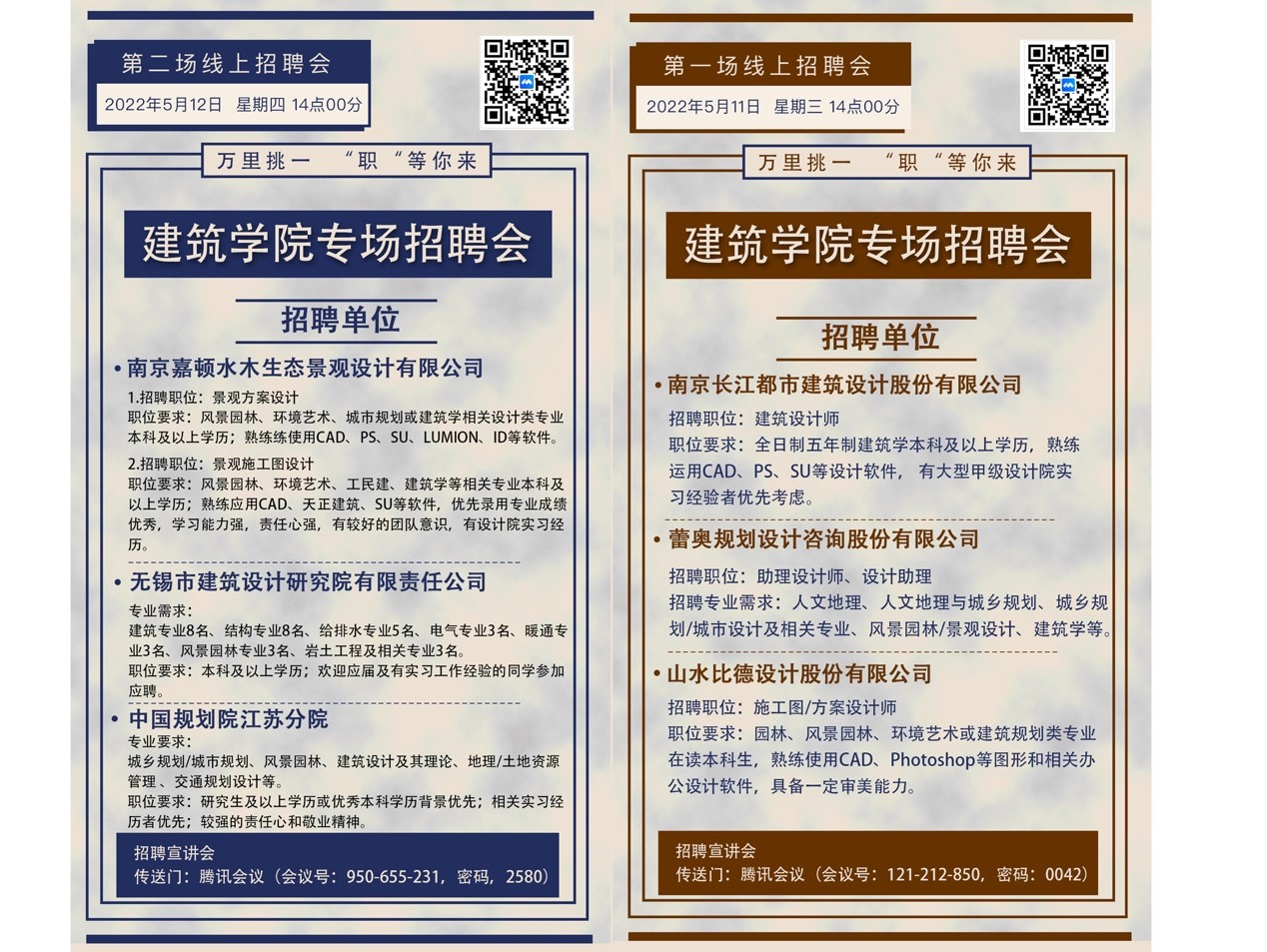 公司按照疫情防控要求,前期充分筹备,遴选出6家与学经理期合作的知名企业,南京长江都市建筑设计股份有限公司、蕾奥规划设计咨询股份有限公司、中国规划院江苏分院、无锡市建筑设计研究院、山水比德设计股份有限公司、南京嘉顿水木生态景观设计有限公司开展线上宣讲招聘。