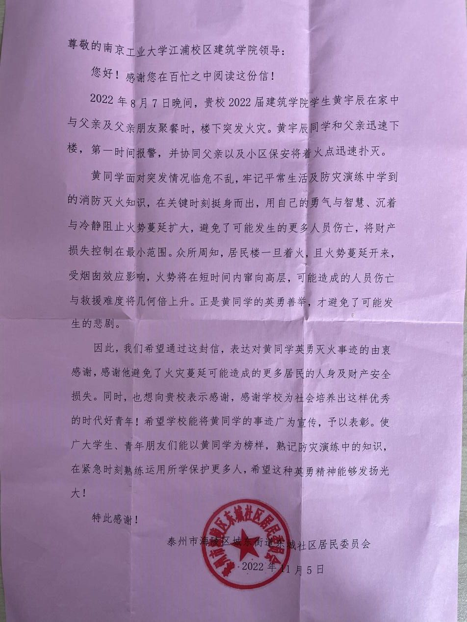 近日,江苏省泰州市海陵区城东街道东城社区居民委员会给tyc122cc太阳成集团寄来一封感谢信,信中通报表扬了公司2022级建筑学专业黄宇辰同学在火灾现场见义勇为的英勇善举。