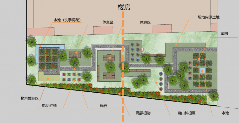 项目小组根据多次前期走访调研形成了两个方案,最终选定方案二进行落地建设。该方案以低成本建设为指导,重在居民参与建设和运营的过程。以一条砾石步道东西贯穿于小区南侧的一处荒废场地,串联起菜园、休息区、垃圾分类知识区、活动区等区域,主要建设材料都将通过再利用物进行建造。设计方案与花园管理公约受到了与会代表的一致好评,路西社区居委会批准立项建设。