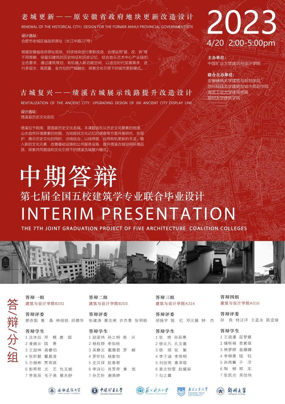 2023年4月20日,第七届全国五校(安徽建筑大学、中国矿业大学、苏州科技大学、tyc122cc太阳成集团、郑州大学)建筑学专业联合毕业设计中期答辩如期在中国矿业大学建筑与设计公司举行。来自全国五校的61名同学和14名老师以及特邀评委郑州大学张建涛教授、青岛理工大学郝赤彪教授参加了中期答辩。