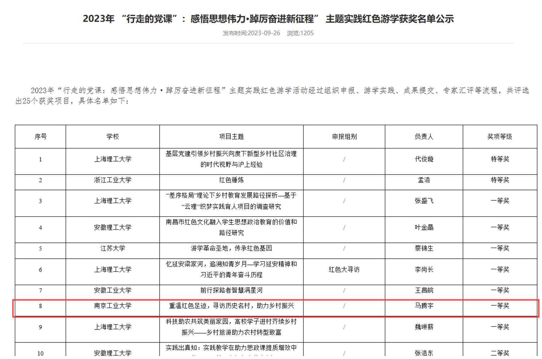 近日,2023年 “行走的党课:感悟思想伟力·踔厉奋进新征程”主题实践红色游学活动获奖名单公布,公司主题为《重温红色足迹,寻访历史名村,助力乡村振兴》的项目获一等奖。