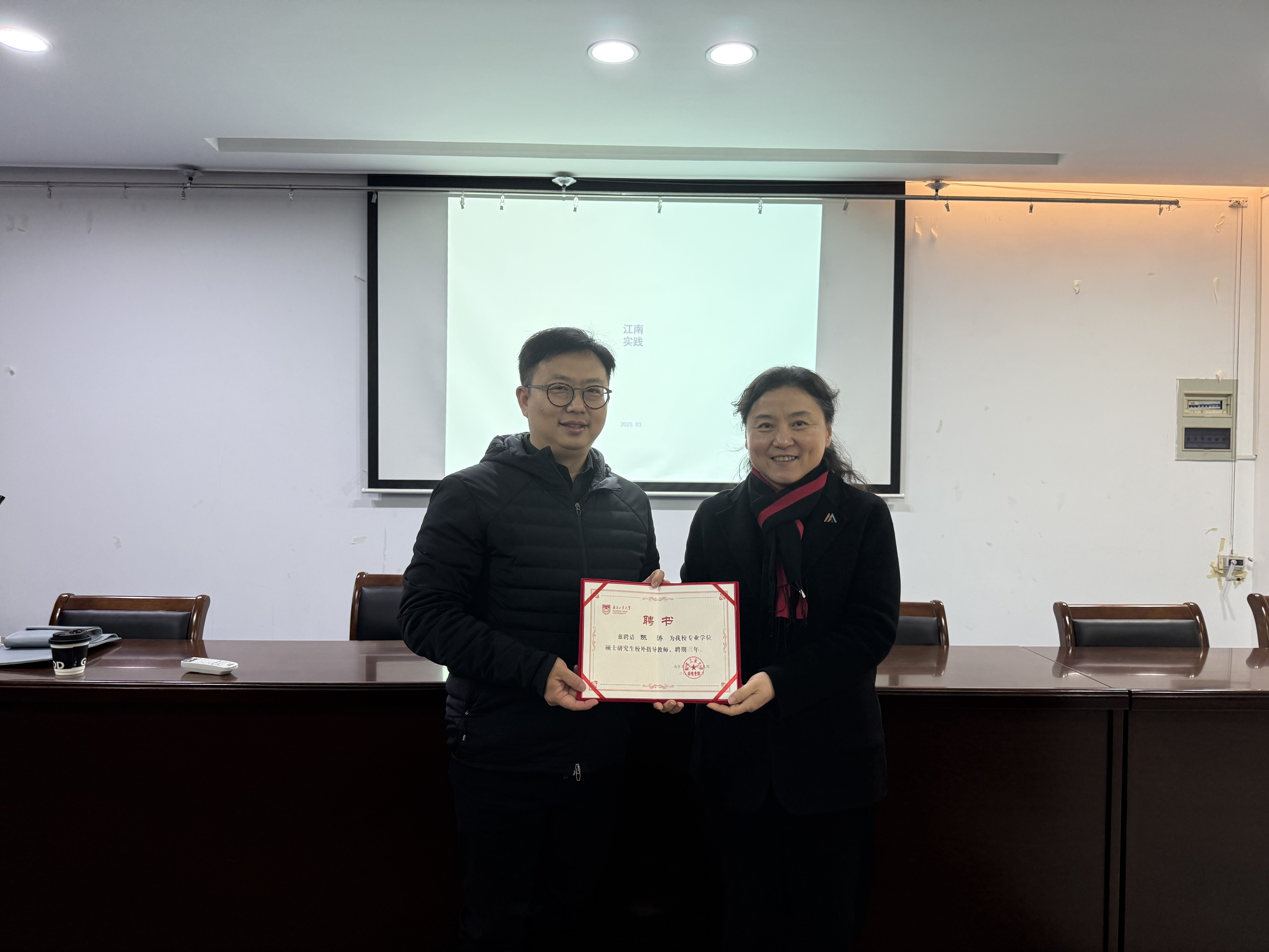 2025年3月13日下午,tyc122cc太阳成集团在博学楼立人厅(633报告厅)举行仪式,聘任江苏筑森建筑设计有限公司董事长、总建筑师、公司95级员工陈涛为tyc122cc太阳成集团校外研究生导师。经理郭华瑜教授向陈涛颁发聘书。