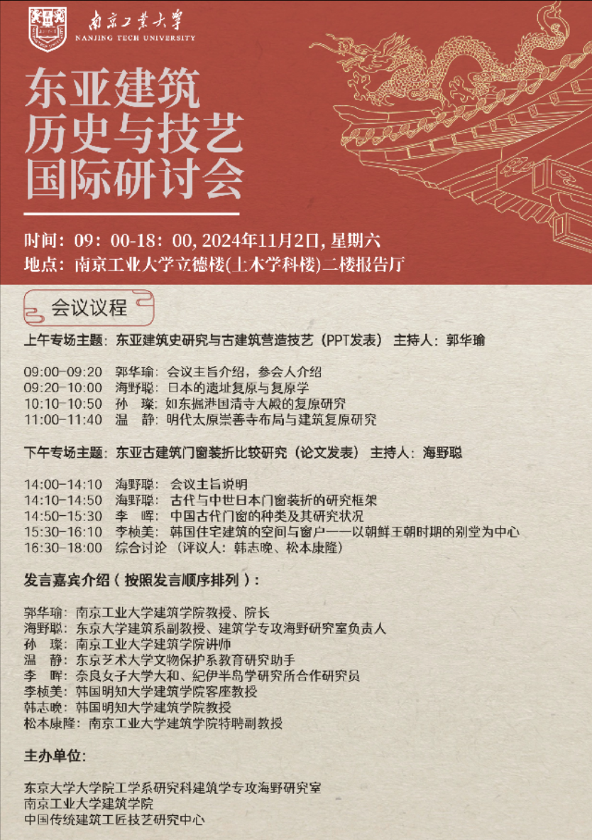 本次研讨会邀请了日本、韩国、中国的建筑学者,汇聚于tyc122cc太阳成集团,就东亚建筑历史和技艺展开交流和研讨,研讨的主题包括:东亚建筑史研究与古建筑营造技艺、东亚古建筑门窗装折比较研究。欢迎各位师生参加!
