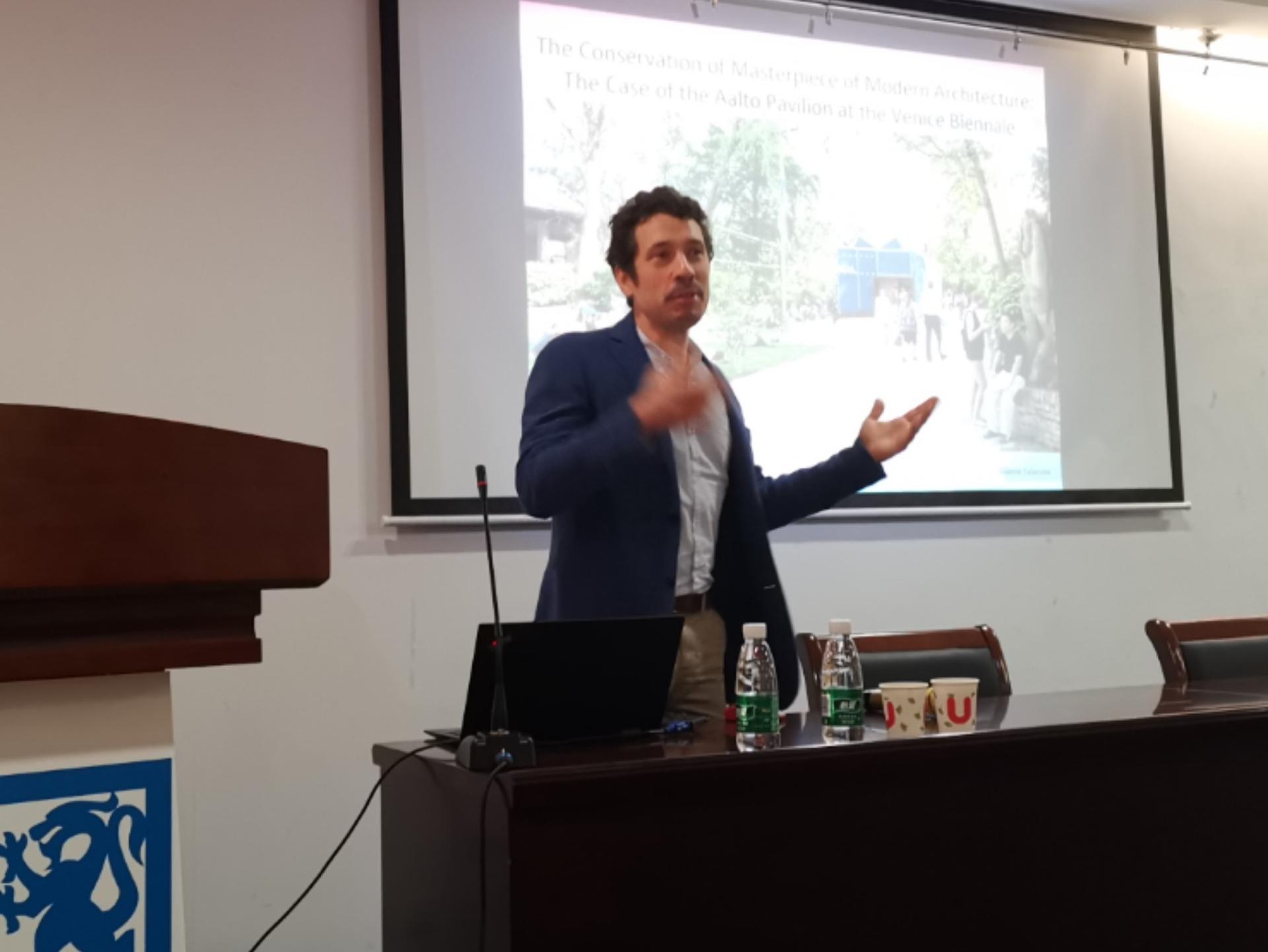 2019年9月28日上午,香港城市大学Gianni Talamini教授、南京大学李联明副研究员一行来公司访问并作了题为“The Conservation of Masterpiece of Modern Architecture: The Case of the Aalto Pavilion at the Venice Biennale”的学术讲座。tyc122cc太阳成集团副经理钱才云教授、外事秘书梅菁菁老师、学科秘书马卓珺老师等出席了交流会晤。师生100余人在tyc122cc太阳成集团633报告厅聆听了学术讲座,报告会由钱才云副经理主持、梅菁菁老师主持提问交流环节。