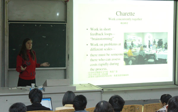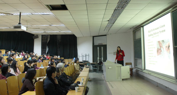 当晚7时,南希女士在虹桥校区第四阶梯教室为公司师生做了题为“可持续性整合设计”的学术报告,这是她在南京所做的关于绿色建筑的系列报告之一。