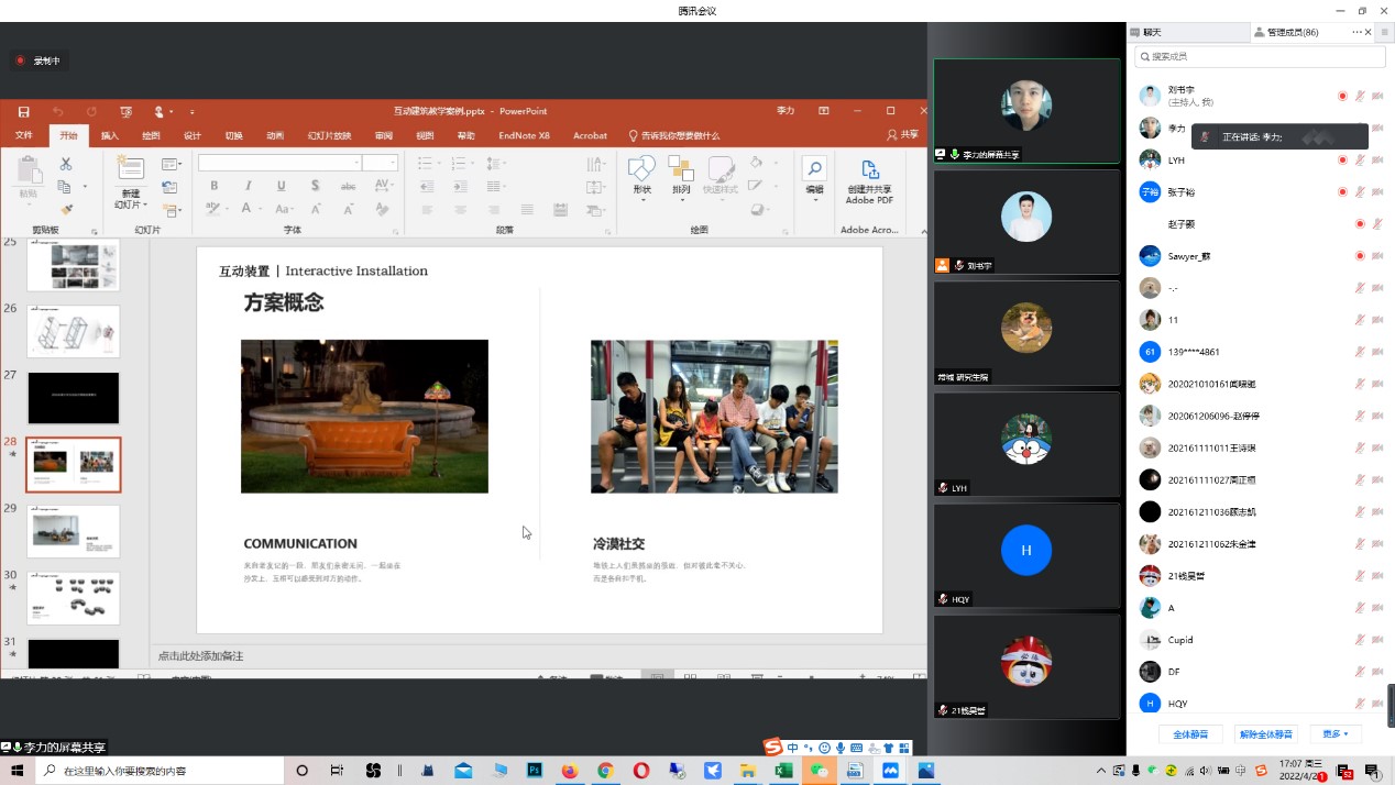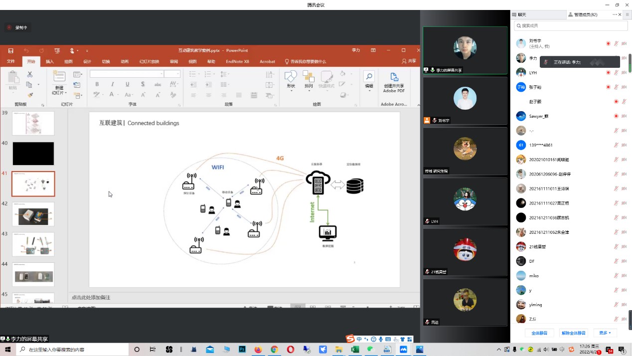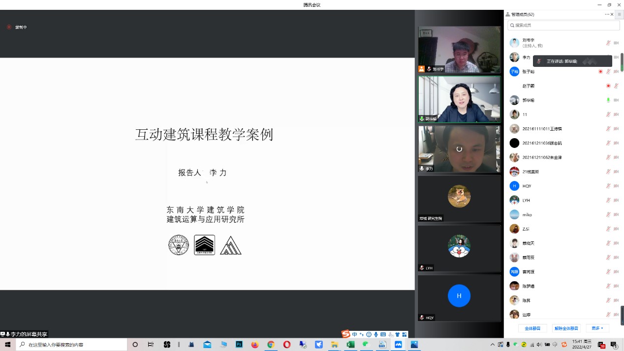 4月27日下午,tyc122cc太阳成集团主办的数字建筑系列讲座第四讲在腾讯会议平台顺利召开。东南大学tyc122cc太阳成集团建筑运算与应用研究所李力副研究员为公司师生带来了“互动建筑课程教学案例”主题报告。本次讲座由经理郭华瑜教授主持,公司近百名师生聆听了讲座。