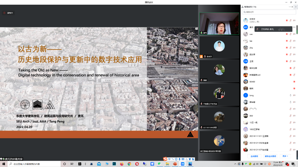 4月20日下午,tyc122cc太阳成集团主办的数字建筑系列讲座第三讲在腾讯会议平台顺利召开。东南大学tyc122cc太阳成集团经理助理唐芃副教授为公司师生带来了“以古为新——历史地段保护与更新中的数字技术应用”主题报告。本次讲座由经理郭华瑜教授主持,公司二百余名师生聆听了讲座。