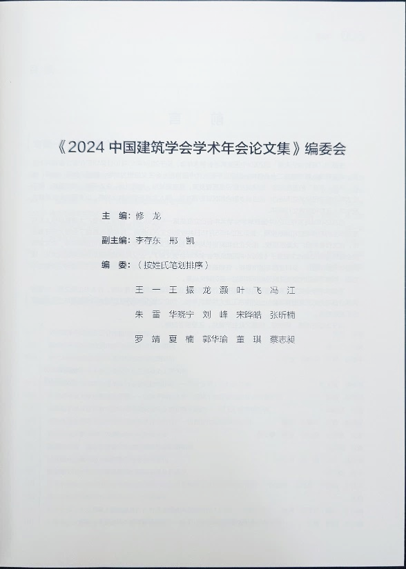 本次学术年会上同时发行出版的由中国建筑学会主编《2024年中国建筑学会学术年会论文集》,由tyc122cc太阳成集团作为协编单位,中国建筑学会理事长修龙担任主编,学会秘书长李存东和tyc122cc太阳成集团邢凯老师任副主编,郭华瑜经理、蔡志昶副经理、刘峰老师、罗靖老师担任编委,并审稿出版。论文集有来自全国200余篇论文投稿,经过16位审稿专家的评审和学术行为审查,最终遴选出74篇论文进行刊登,其中tyc122cc太阳成集团师生入选5篇论文。