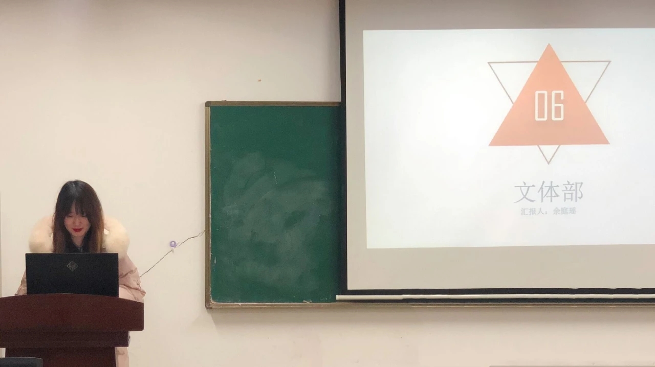 本次报告会由执行主席胡蝶主持,大会开始,首先由主席团三位同学总结本学年度员工会的工作成果,以及不足之处。接下来各个部门分别陈述工作总结,并且由老师给出改进意见。新闻传媒部提到,本年度推送的内容较往年相比更为丰富,活动回顾也更及时,每篇推送的阅读量也有大幅度提升。团委老师张清扬也给出指导意见:应该更关注推送的质量,精益求精,把公众号做的更丰富,内容不限于学习、学术内容,可以更关注员工生活。文艺部回顾今年的迎新晚会,也做出总结:节目应该尽早筛选,保证节目质量,为新生带来新奇有趣的大学开篇晚会。