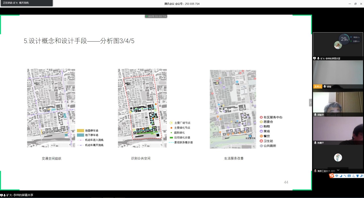 2020年3月16日上午,tyc122cc太阳成集团、苏州科技大学、郑州大学和中国矿业大学四校建筑学专业联合毕业设计第一轮方案汇报会顺利举行。与3月2日举行的开题仪式相同,本次方案汇报交流及教学讨论,均通过腾讯会议线上平台进行。在克服不能到现场调研等困难后,各校员工均顺利完成了第一轮方案设计。