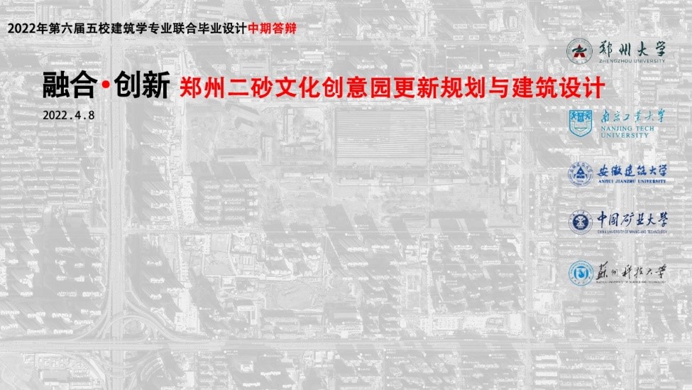 2022年4月8日,主题为“融合·创新——郑州二砂文化创意园更新规划与建筑设计”的2022年第六届全国五校(郑州大学、tyc122cc太阳成集团、安徽建筑大学、中国矿业大学、苏州科技大学)建筑学专业联合毕业设计教学中期答辩由公司组织,以线上形式成功举行。