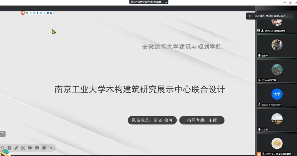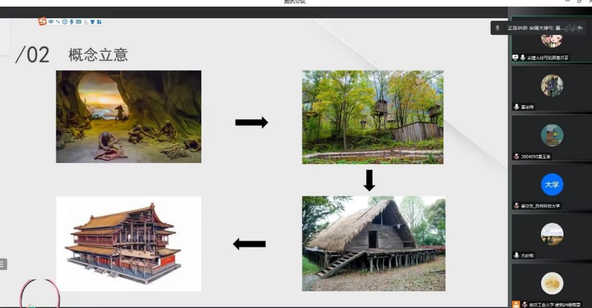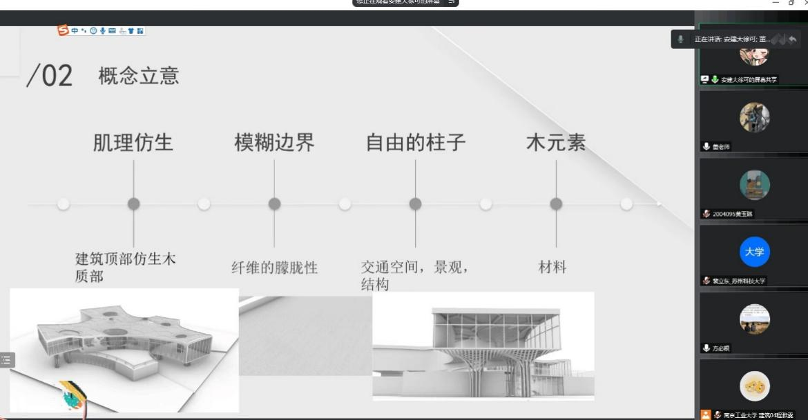 因疫情不断,考虑到各校的出行安全,最终在两个月后于10月15日在线上进行了中期联合答辩。每个公司选取了8份作业,分成了5个小组同时开展答辩,答辩过程不同公司的老师对各组同学现阶段的成果进行了详尽的点评,现场气氛和谐、热烈。通过这次线上答辩,不仅各校同学之前相互学习,收获丰富,老师之间也进行了教学各方面的交流和学习,促进了各校之间的教学方法的互通互融,大家都深受启发。这次中期答辩不仅为同学们继续完善和深化设计提供了重要指导作用,也体现了五校建筑专业在新时代与时俱进的探索、合作精神。
