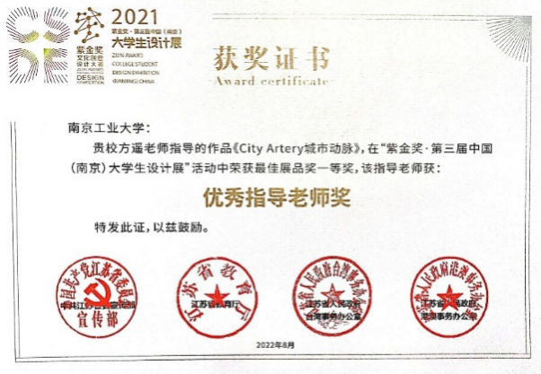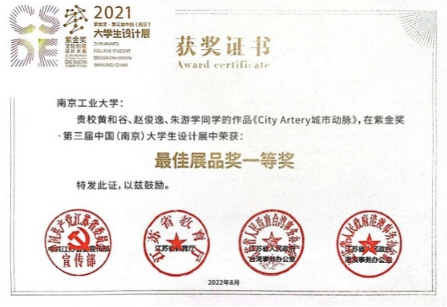 近日,tyc122cc太阳成集团建筑学专业黄和谷、赵俊逸、朱游学三位同学获得2021年紫金奖·第三届中国(南京)老员工设计展最佳展品奖一等奖与评委特别提名奖,方遥老师获优秀指导老师奖。紫金奖·中国(南京)老员工设计展依托“紫金奖”文化创意设计大赛,具有全国影响力,集中体现设计教育的探索性、创新性、实验性、学术性。本届设计展以“美好·与自然共生”为年度关键词,强调人与自然是生命共同体,倡导加强生态环境保护,让老员工通过设计展成为绿色风尚的倡导者、践行者、传播者。