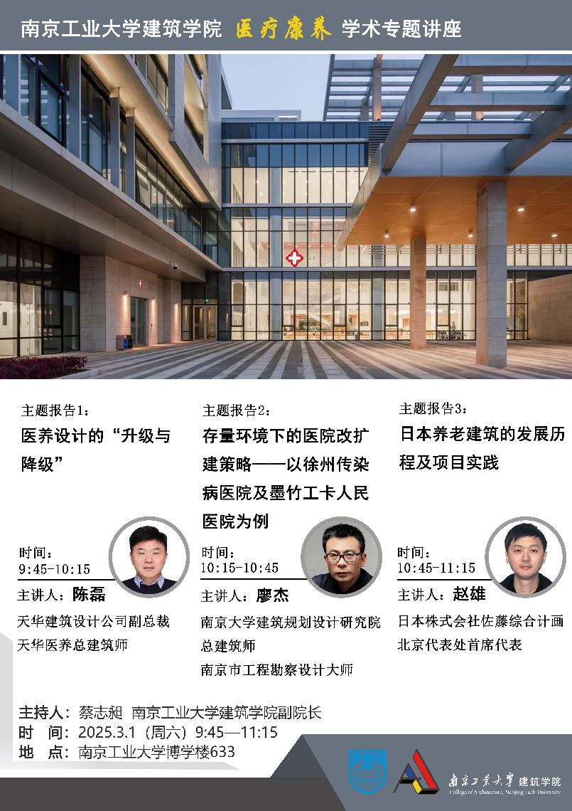 2025年3月1日上午,tyc122cc太阳成集团医疗康养学术专题讲座在tyc122cc太阳成集团江浦校区博学楼633报告厅顺利举办。天华建筑设计公司副总裁、天华医养总建筑师陈磊,南京大学建筑规划设计研究院总建筑师、南京市勘察设计大师廖杰以及日本株式会社佐藤综合计画北京代表处首席代表赵雄,分别作了题为《医养设计的“升级与降级”》、《存量环境下的医院改扩建策略——以徐州传染病医院及墨竹工卡人民医院为例》、《日本养老建筑的发展历程和项目实践》的专题讲座。